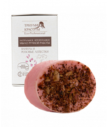 Мыло натуральное Ваниль и розовые лепестки от компании Триумф Красоты производится вручную и подходит для всех типов кожи. Имеет в составе пептиды нитей шелка, который делает кожу бархатной. Подходит для лица и тела.